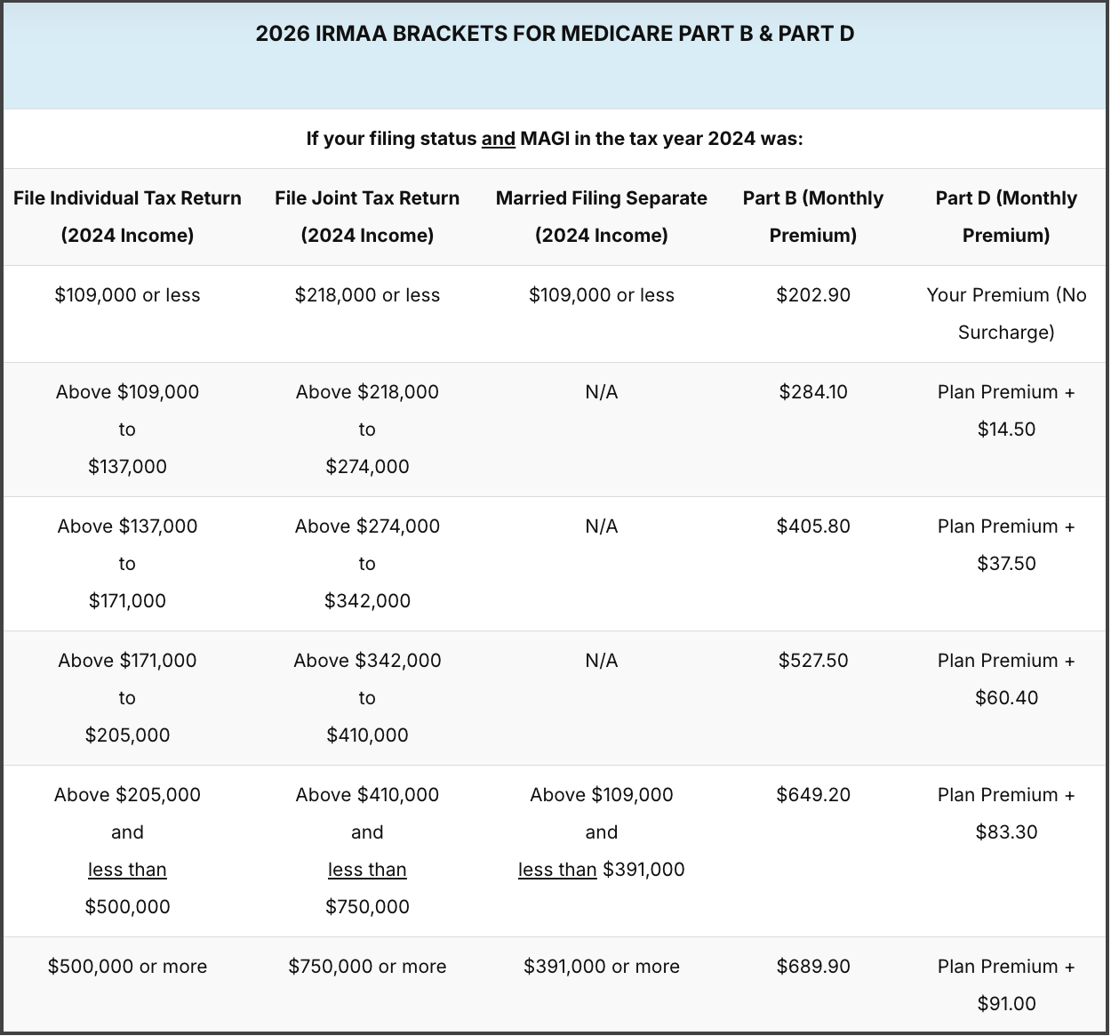 2026 IRMAA Brackets (Based on 2024 MAGI):